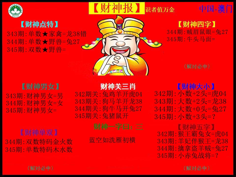 345期: 澳门六合皇彩圖信封【黄财神报】每期自动更新